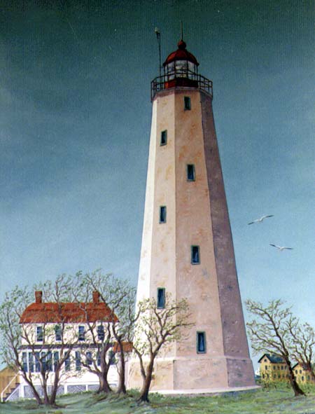 Sandy Hook Lighthouse with lighthouse keepers dwelling. The oldest working light is situated at Fort Hancock.