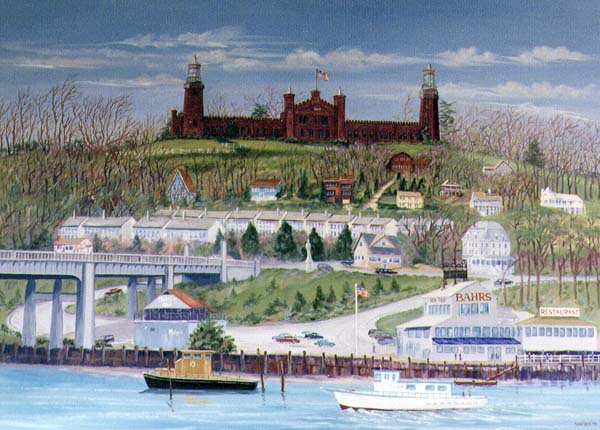 The Twin Lights overlooking the Shrewsbury River with the popular Bahr's Restaurant.